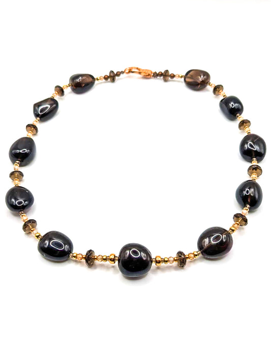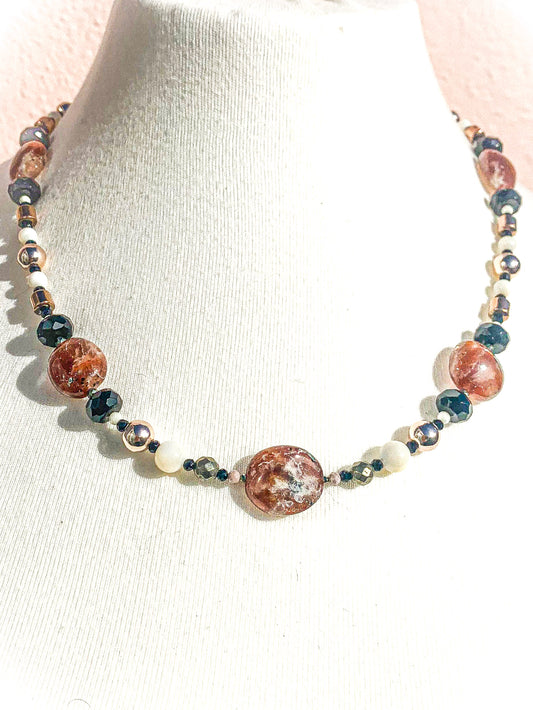 HAUTE - Smokey Quartz, Sunstone, Pyrite, Hematite, CZ, Mother of Pearl Necklace /H19