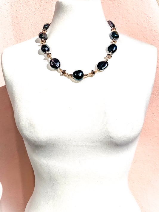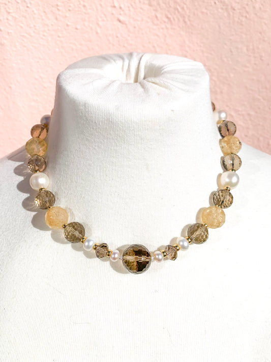 HAUTE : Smoky Quartz, Rutilated Quartz, Pearl, CZ & Solid Gold Necklace /H24
