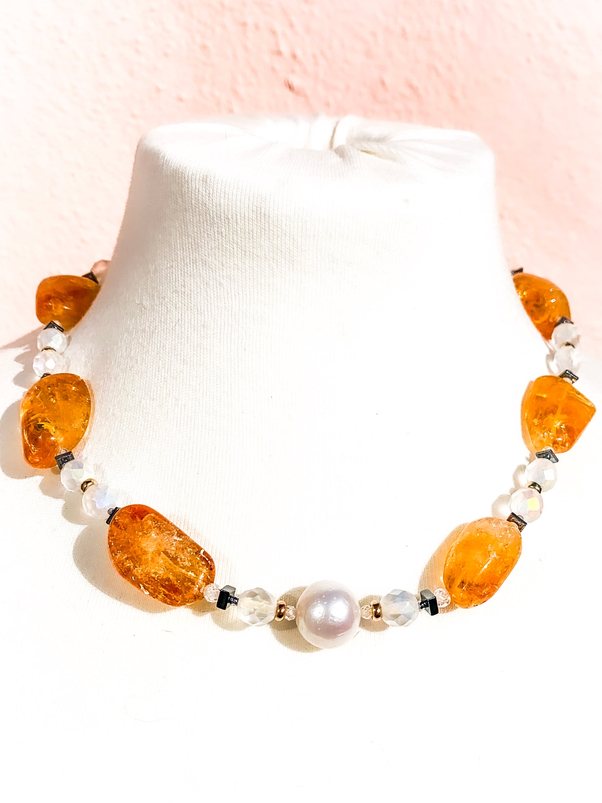 Haute : Art Deco - Citrine, Pearl, Solid Gold, CZ, Hematite, Frosted Crystal Necklace - Short /H4AD