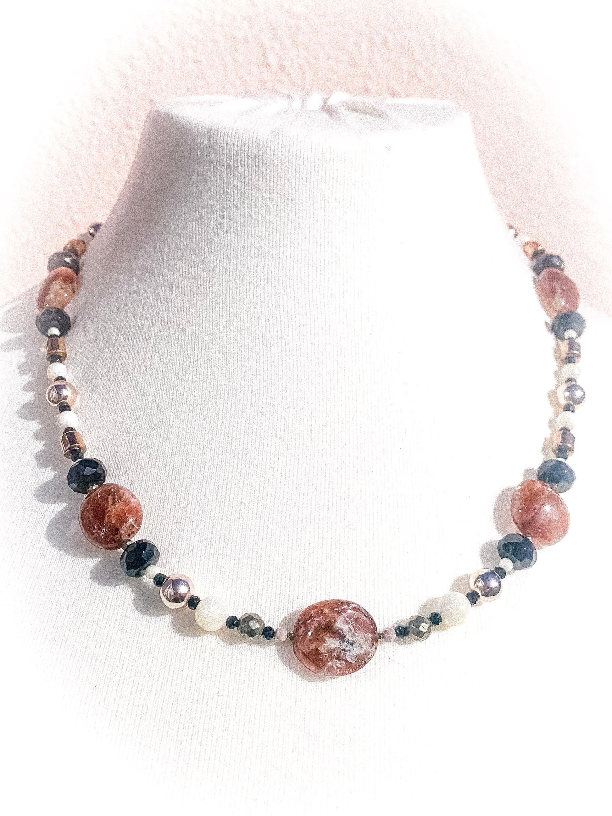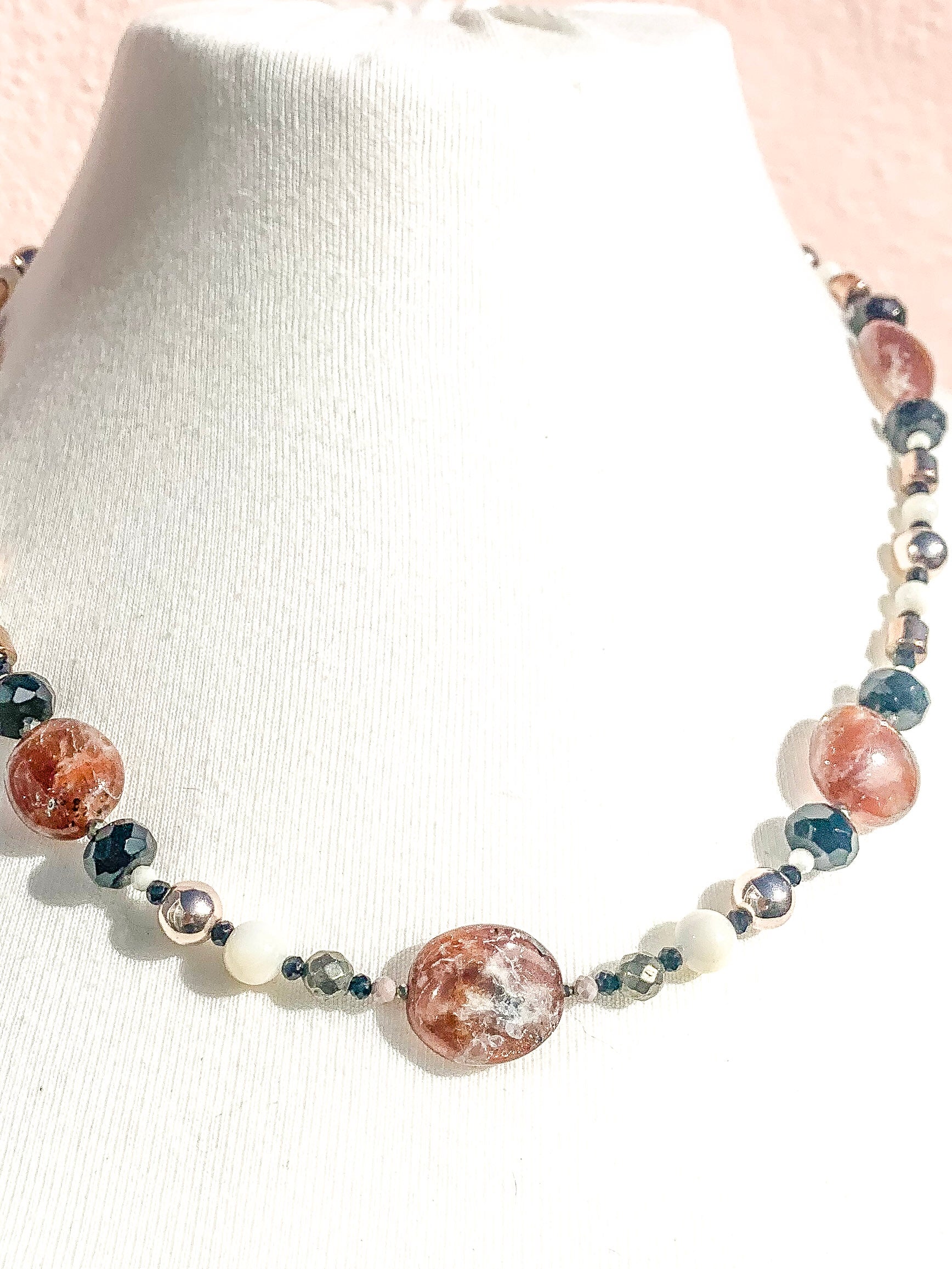 HAUTE - Onyx, Sunstone, Pyrite, Hematite, CZ, Mother of Pearl Necklace /H20
