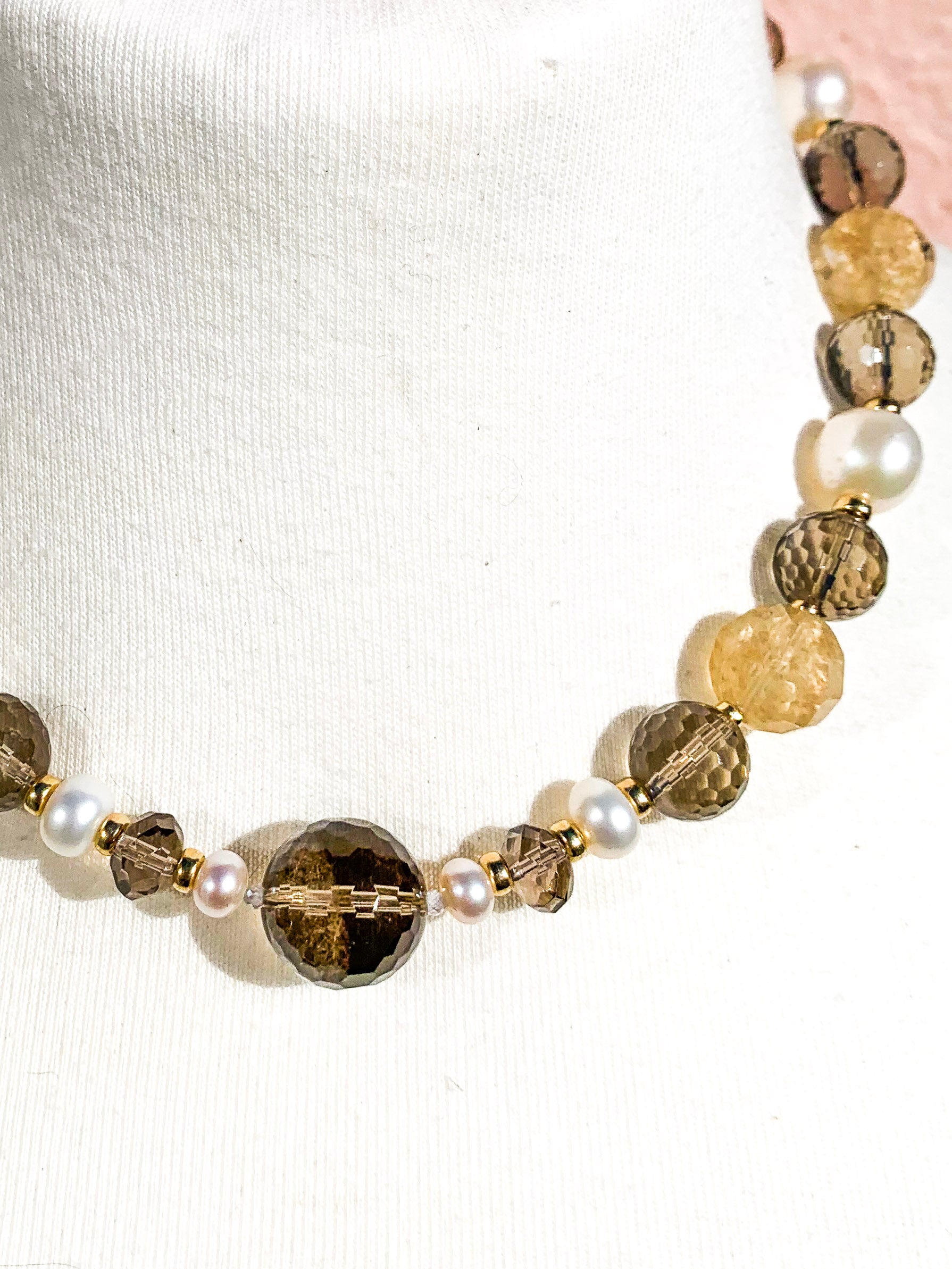 17.5” Smokey Quartz (Faceted), Rutilated Quartz (Faceted), Pearl (Cultured), Clear Cubic Zirconia, Solid Gold w/ 925 Vermeil Magnet Necklace