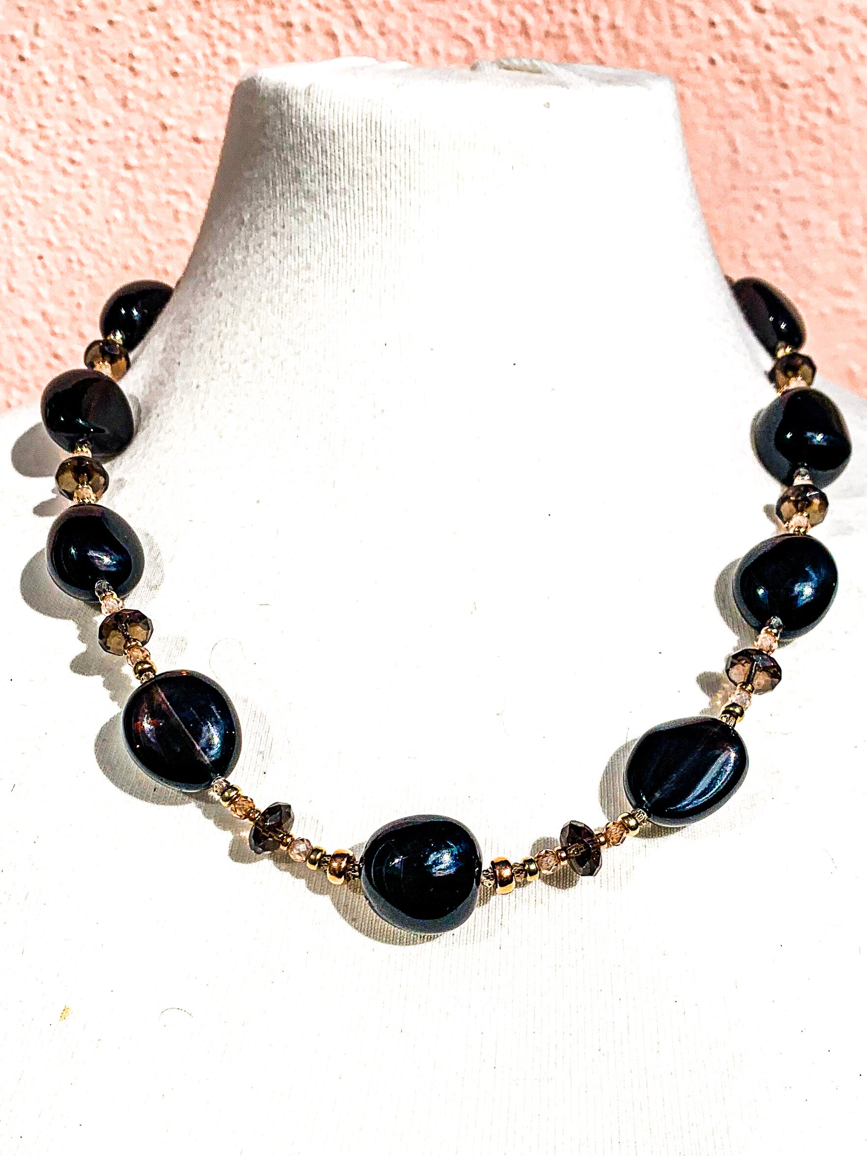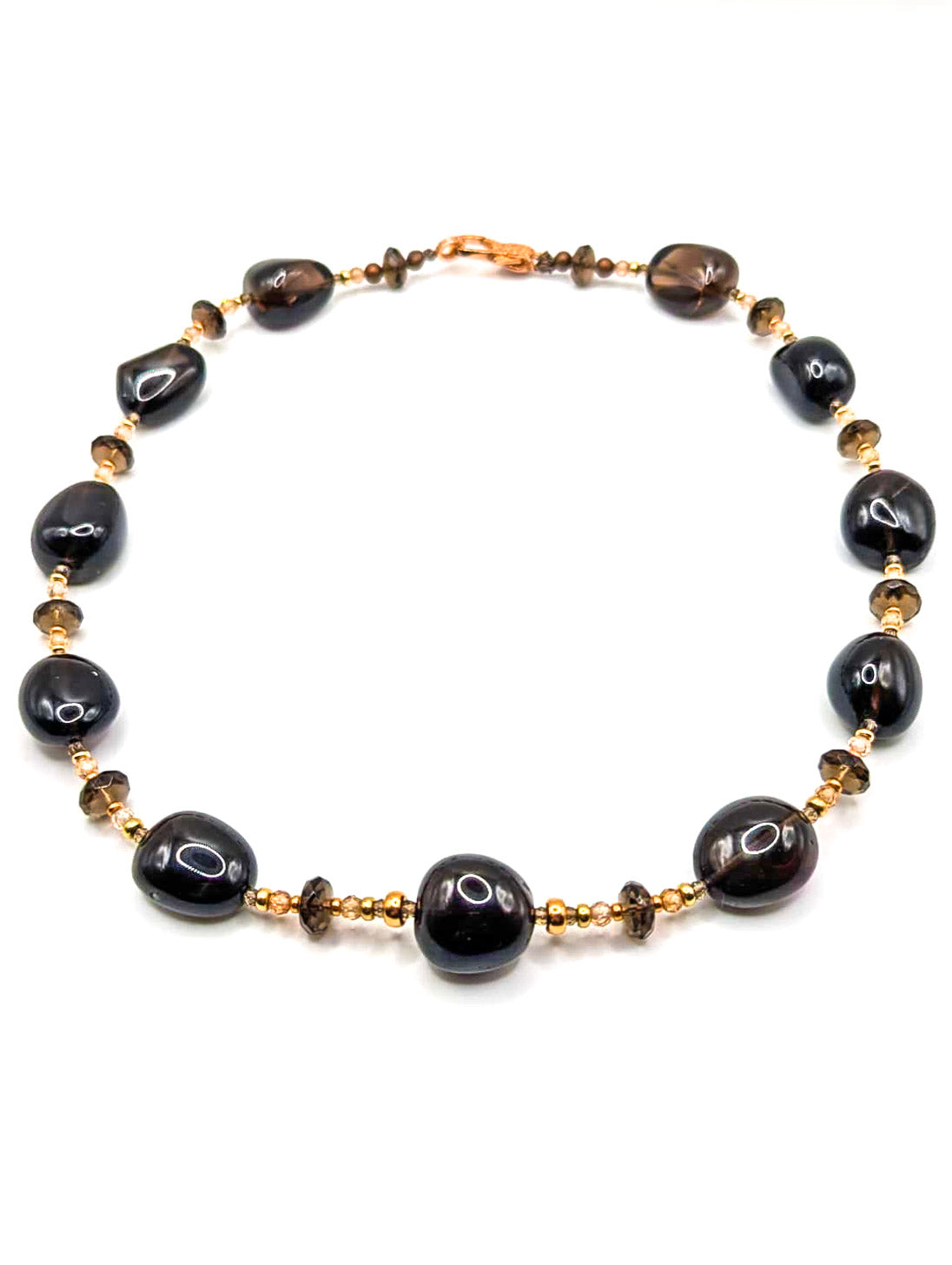 23” Smokey Quartz (Faceted & Non Faceted), Solid Yellow Gold, Rose Gold Filled, Blush Cubic Zirconia w/ Rose Cubic Zirconia Clasp Necklace. Please Note the longer length Necklace can be joined to make a two or three string Necklace.