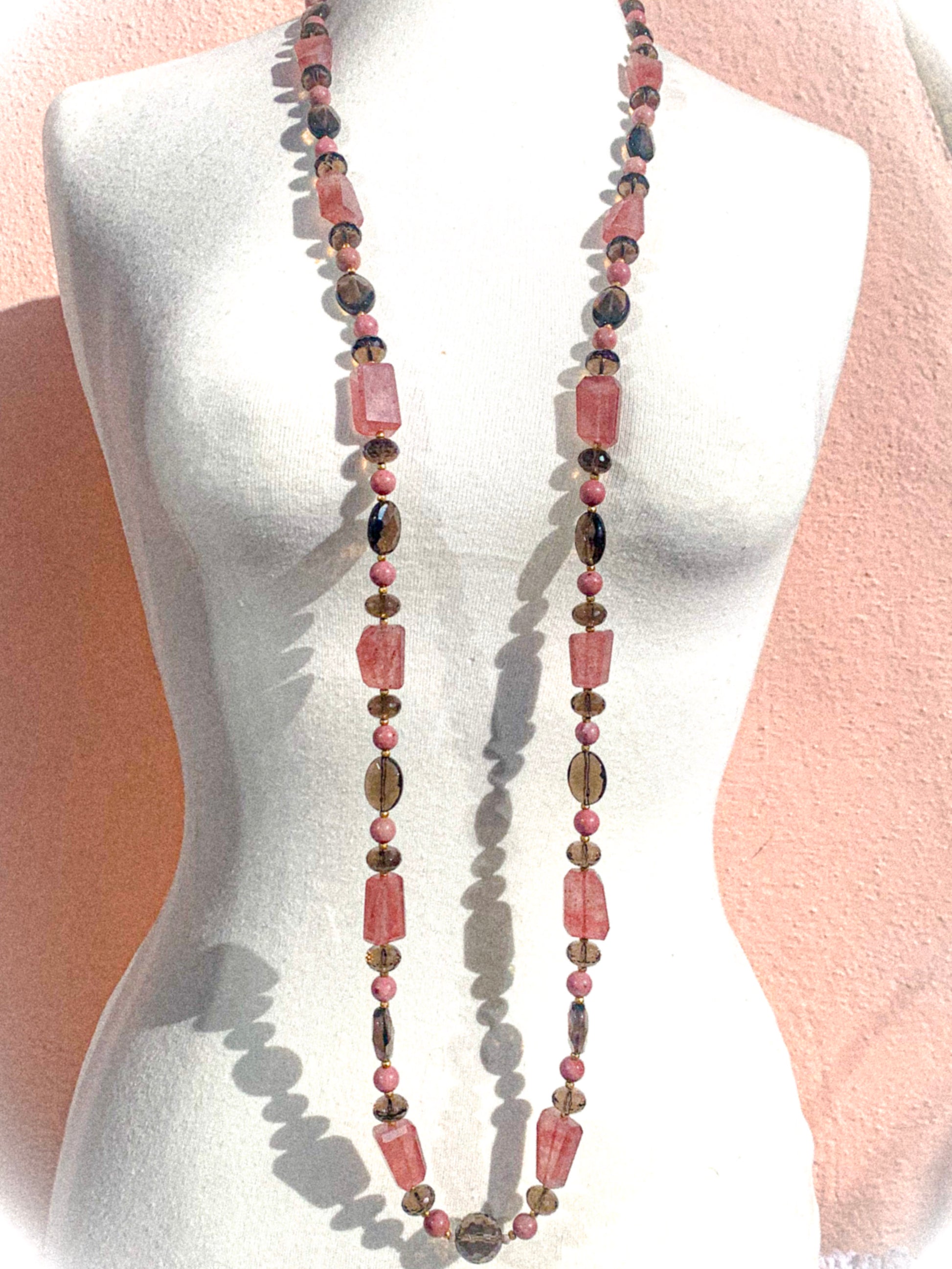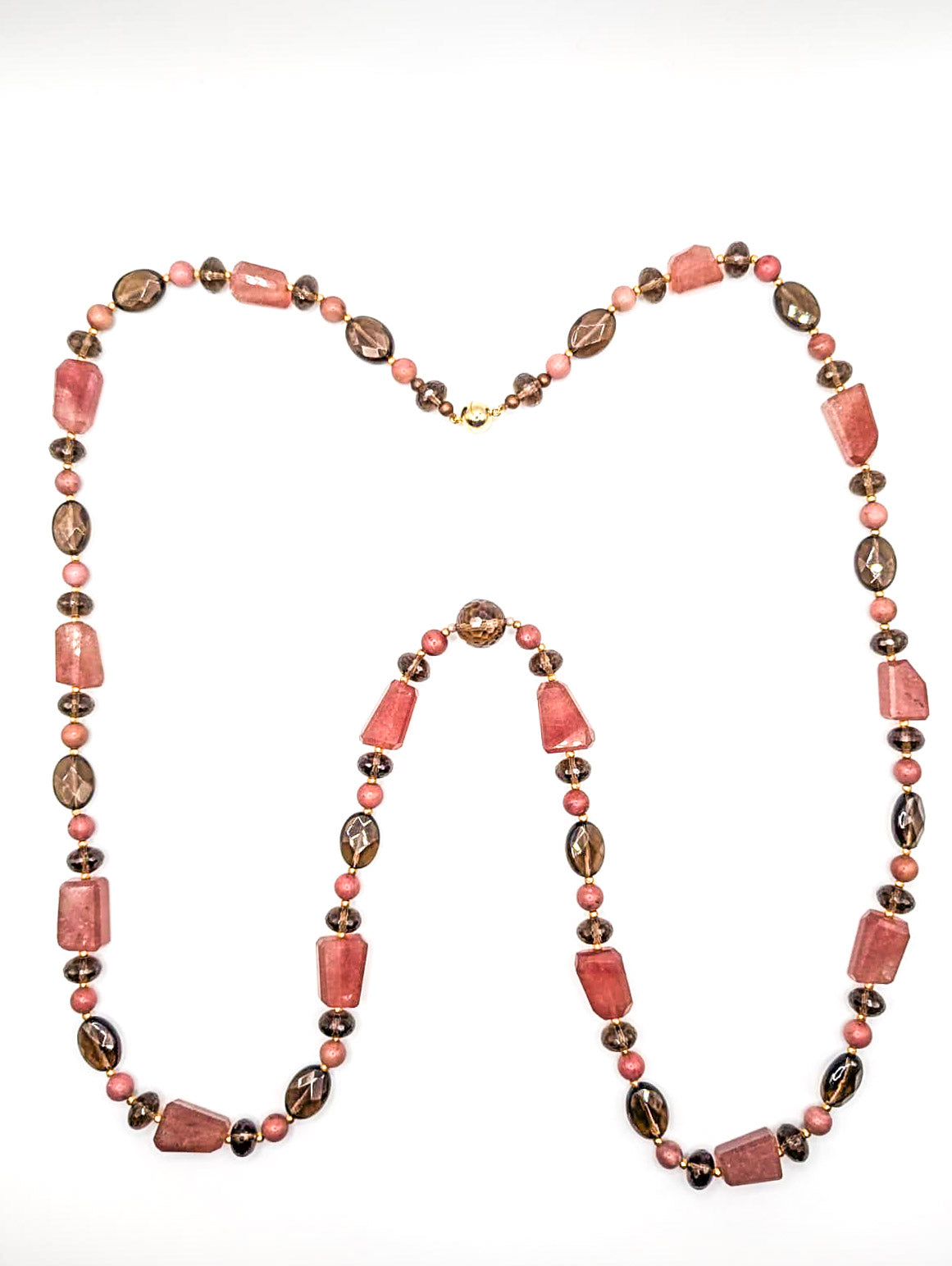 50” Strawberry Quartz, Smokey Quartz (Faceted), Jasper, Mauve Cubic Zirconia, Matt Gold Glass w/ 925 Vermeil Magnet